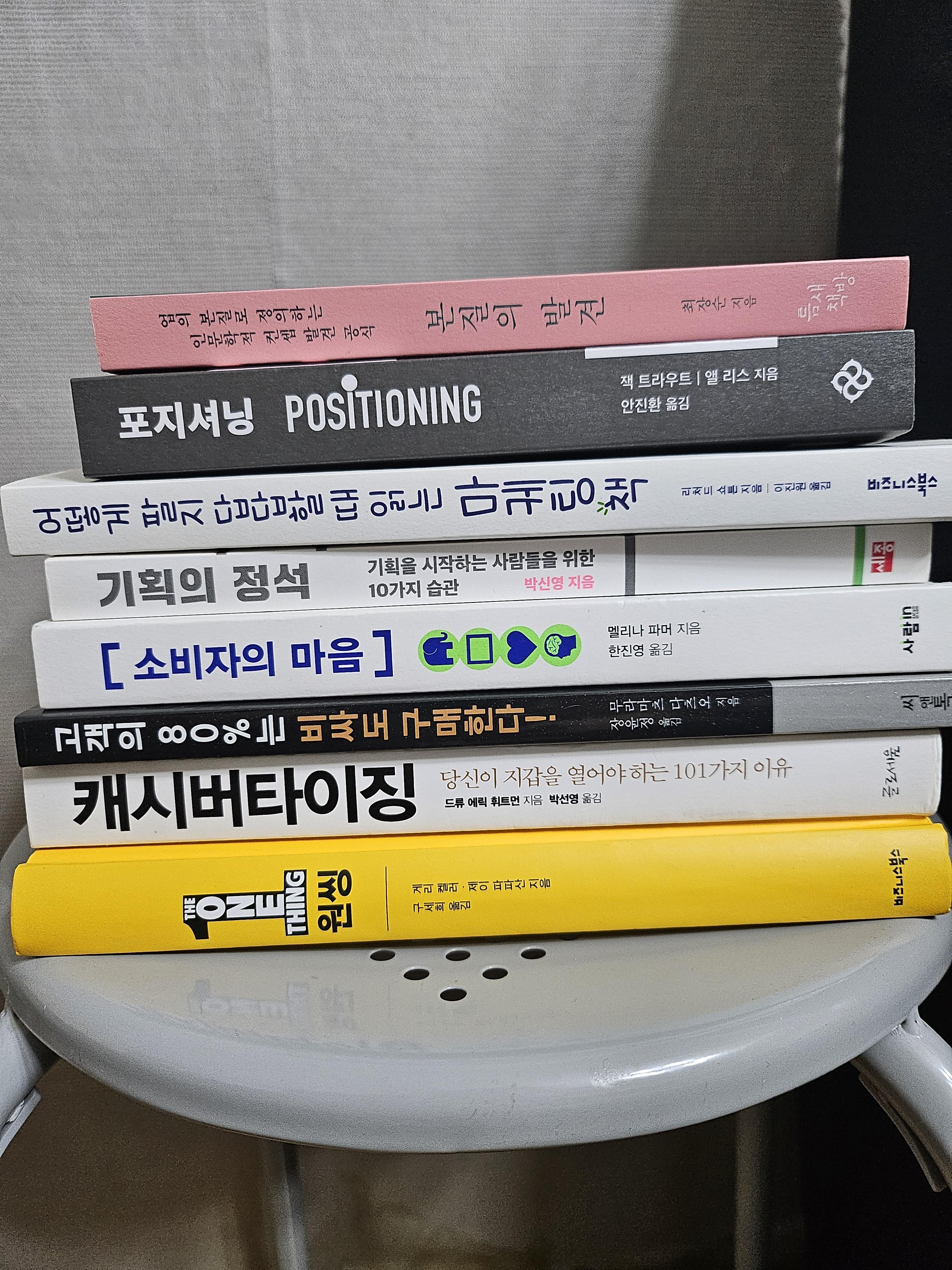 지금까지 읽은 책들이 기억나는 것만해도《 소비자의 마음》,《 캐시버 타이징》,《 고객의 80%는 비싸도 구매한다》,《 어떻게 팔지 답답할 때 읽는 마케팅 책》,《마케팅 설계자》등의 마케팅 관련 서적과 《 본질의 발견》,《 포지셔닝》, 《 기획의 정석》,《퍼스널 브랜딩》,《 그래서 브랜딩이 필요합니다》,《 오늘부터 나는 브랜드가 되기로 했다》...등 적지는 않은 듯 한데 사실 읽은 책의 개수가 중요한 게 아니라 현장 실무에서 얼마나 실천했느냐가 더 중요하잖아요.