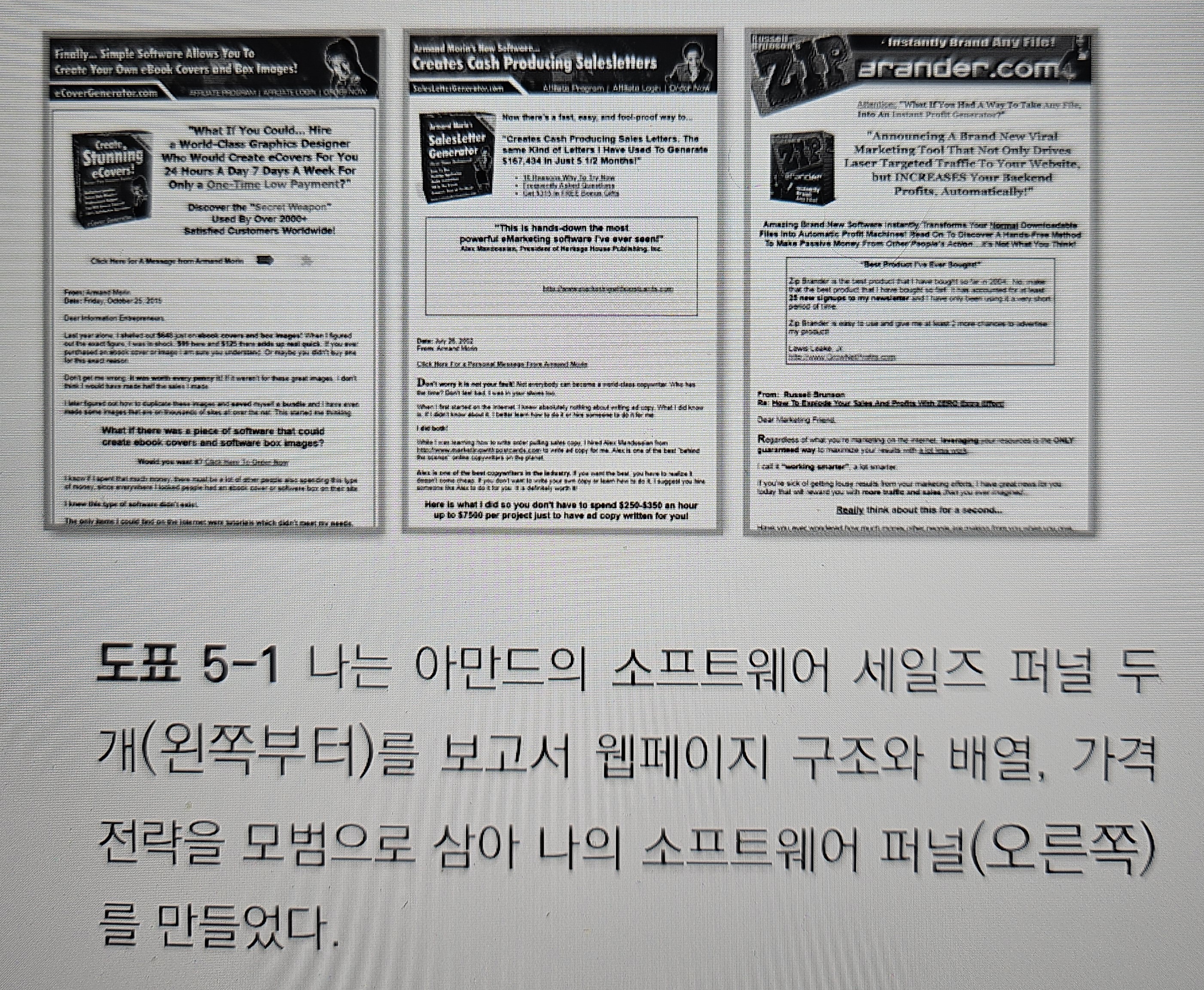 저자는 좌측 두개의 소프트웨어 웹페이지 (아만드 모린의 세일즈퍼널))의 외관, 느낌, 배열 그리고 가격까지 모두 아만드 모린이 만든 것을 모델링해서 비슷하게 만들었기 때문이다.