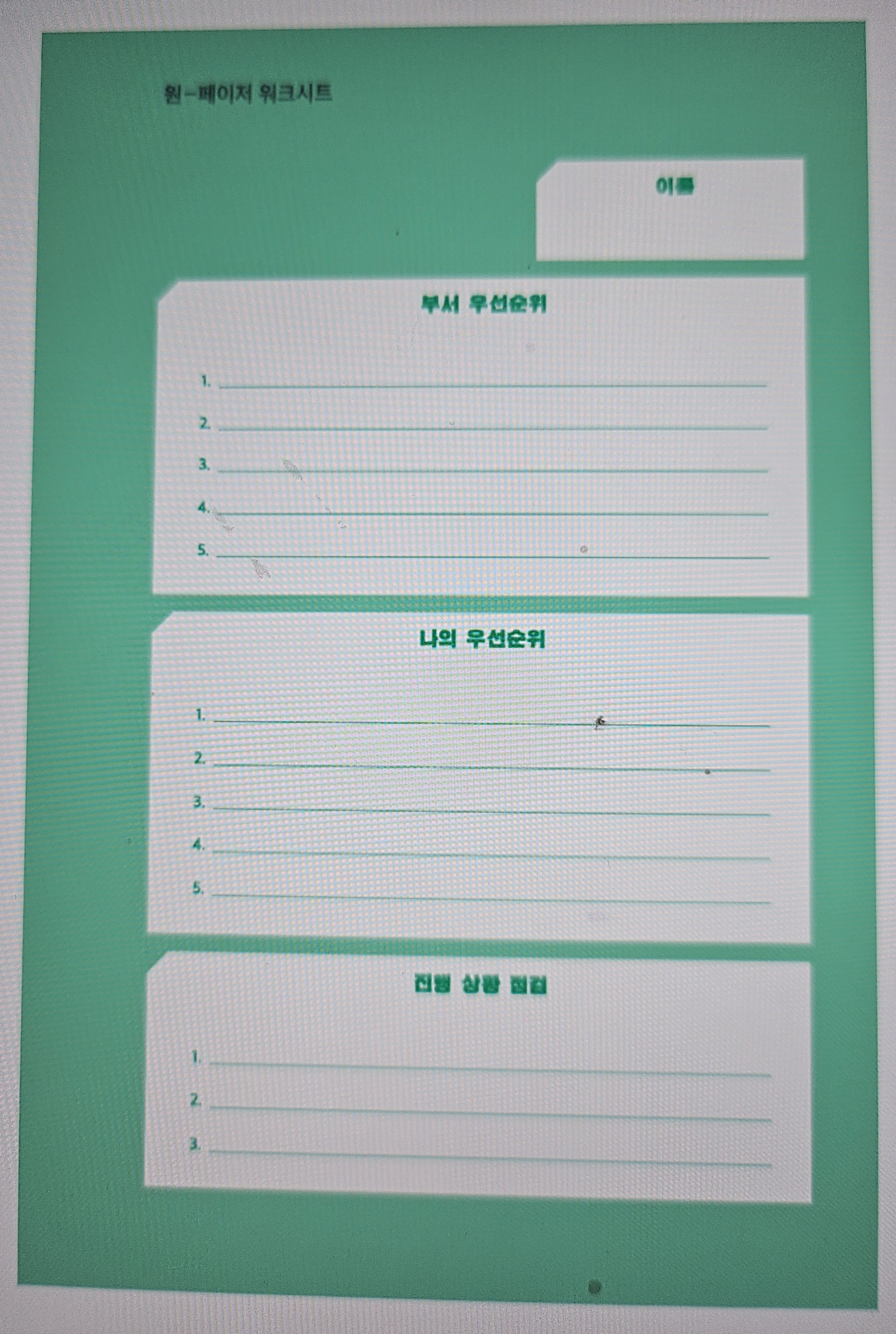 원-페이저 워크시트는 의도적으로 단순하게 쓴다. 착수 회의에서 결정된 성공에 대한 명확한 관점을 검토한 후에 부서의 상위 5개 우선순위와 개인의 상위 5개 우선순위를 써서 잘 보이는 곳에 붙여둔다.