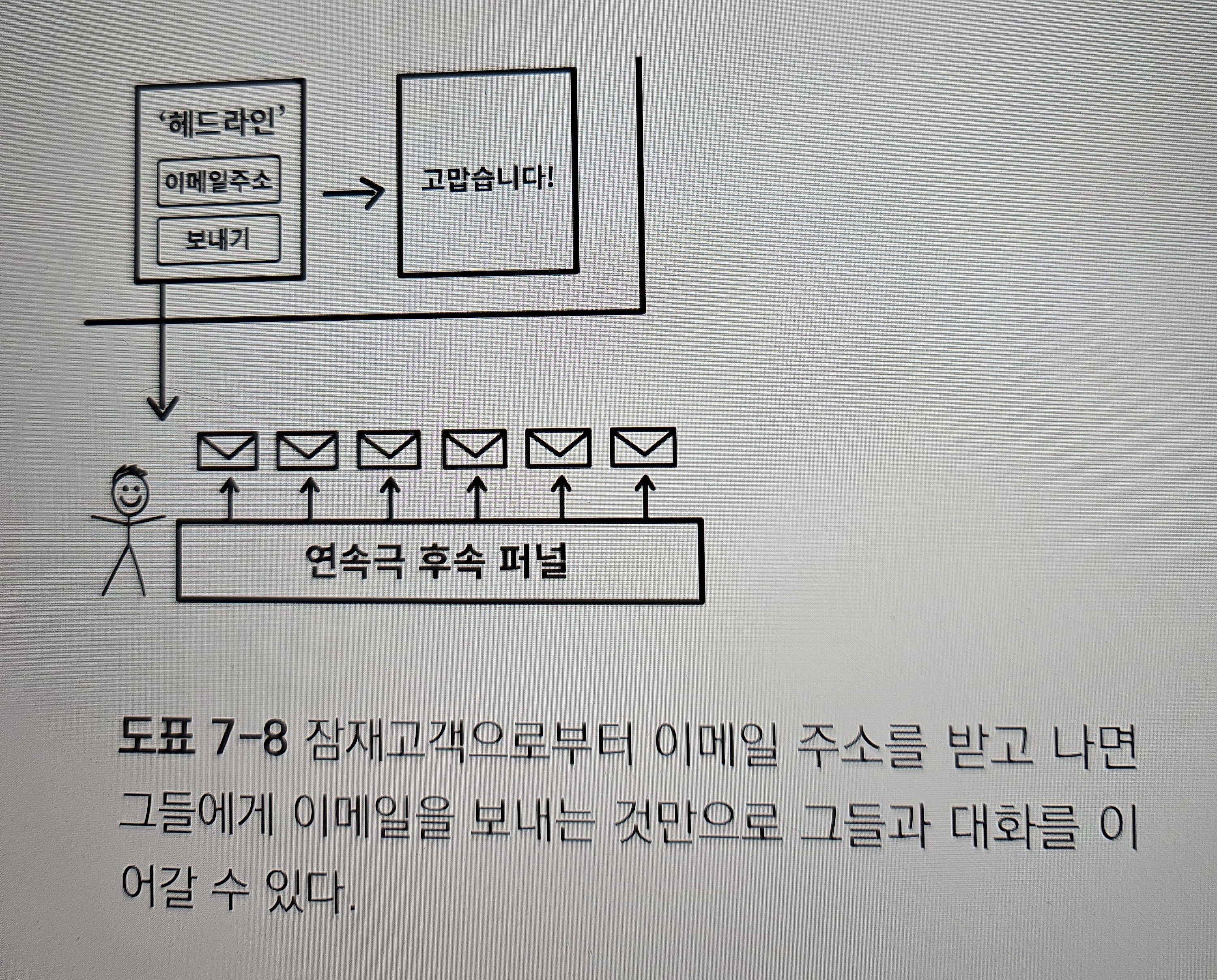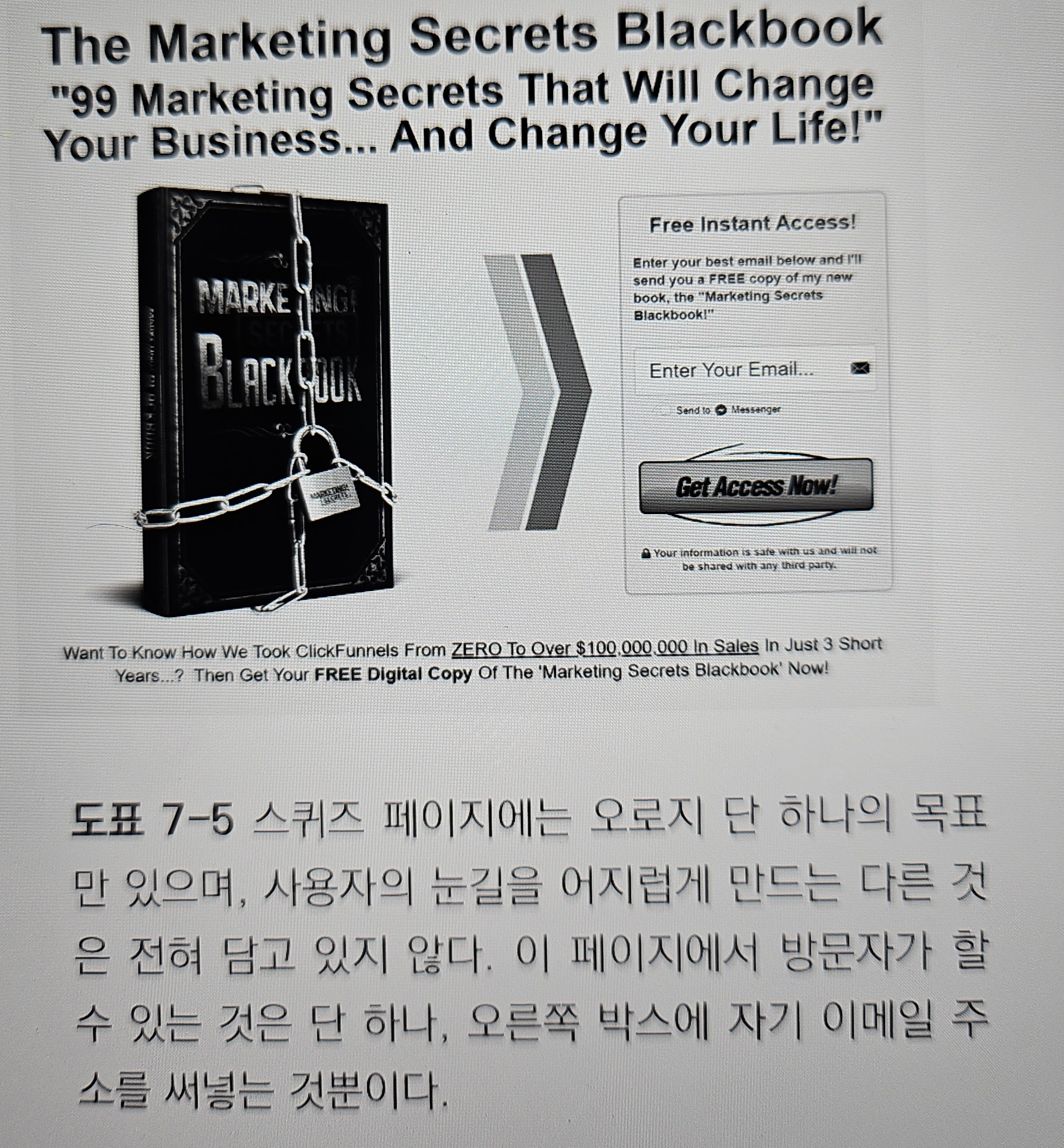 저자는 구매하여 얻는 통제하는 방문자를 '스퀴즈 squeeze 페이지'라는 랜딩 페이지로 보내어 이메일주소를 얻어낸다.