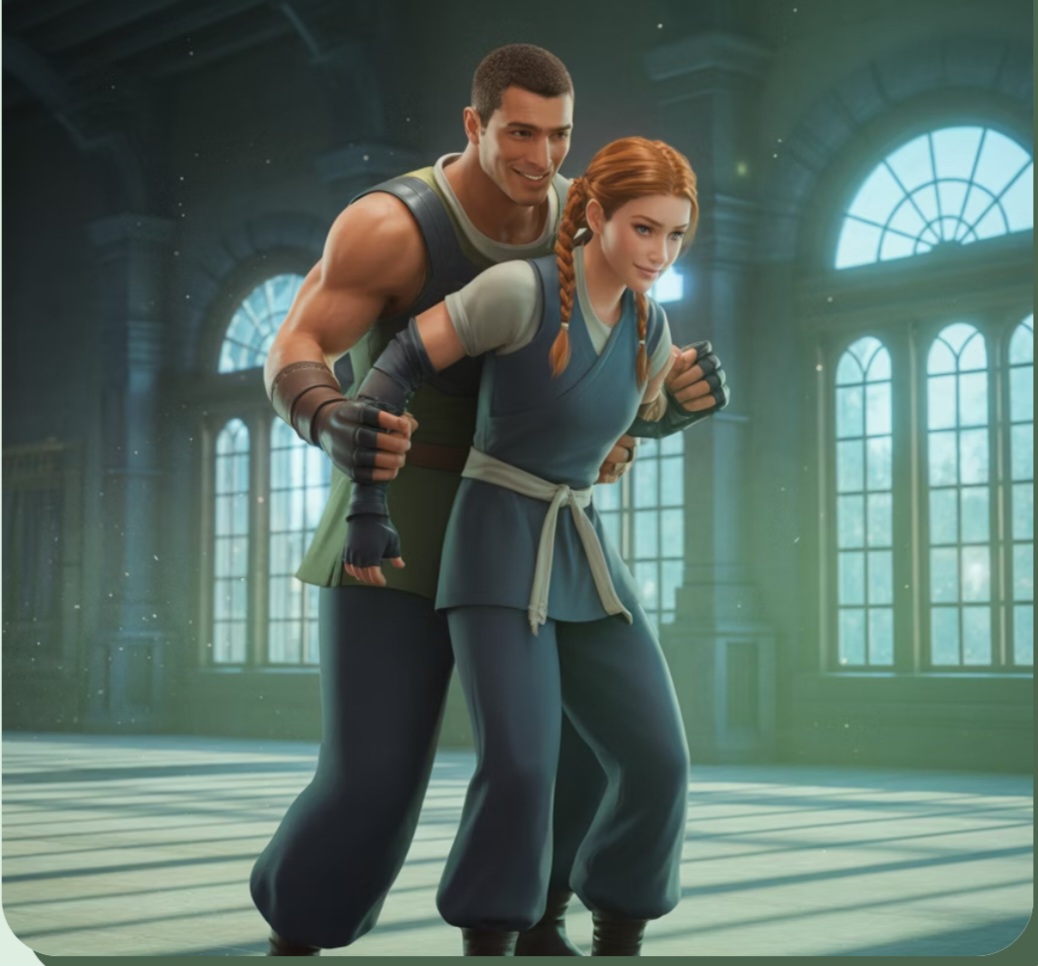 Xaden이 바이올릿의 팔을 고정한 채 등 뒤에서 기술을 가르치는 순간.