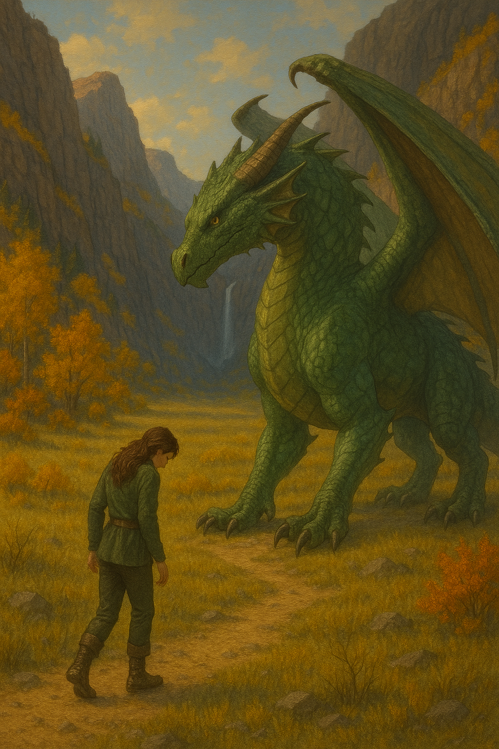 바이올릿이 눈을 내리깐 채, 거대한 초록 드래곤 앞에 선다.