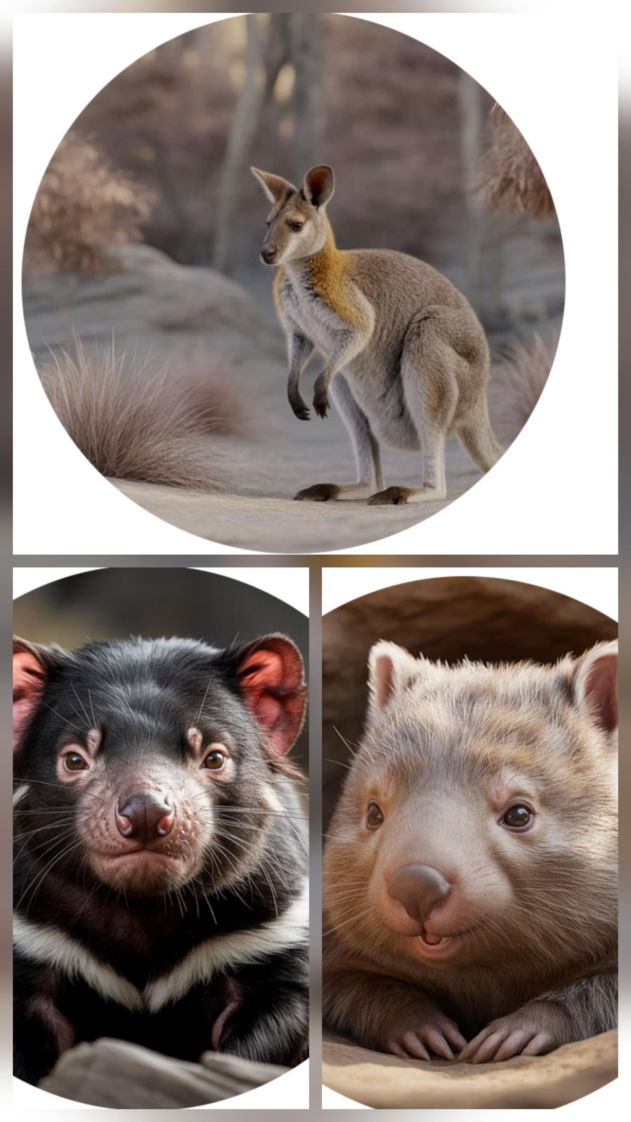 현존하고 있는 왈라비 - 웜뱃 - 태즈메니아 데블 (위에서 시계 방향으로) AI 생성이미지