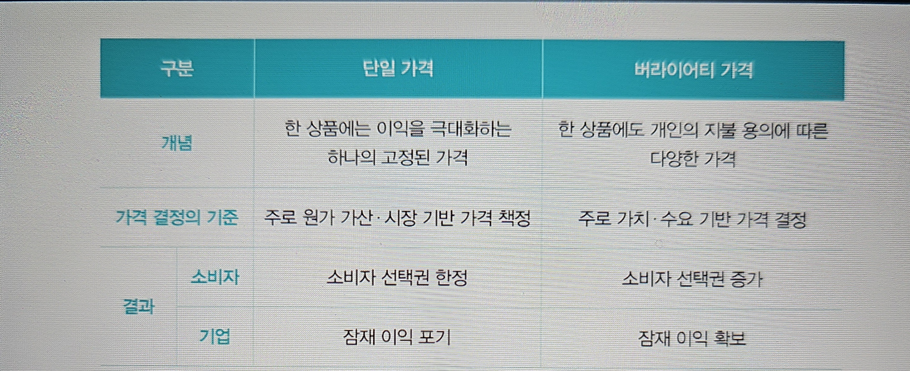 단일 가격과 버라이어티 가격이 가격의 결정의 기준과 그 결과에서 어떤 차이를 보이는지 아래 표에서 알 수 있다.