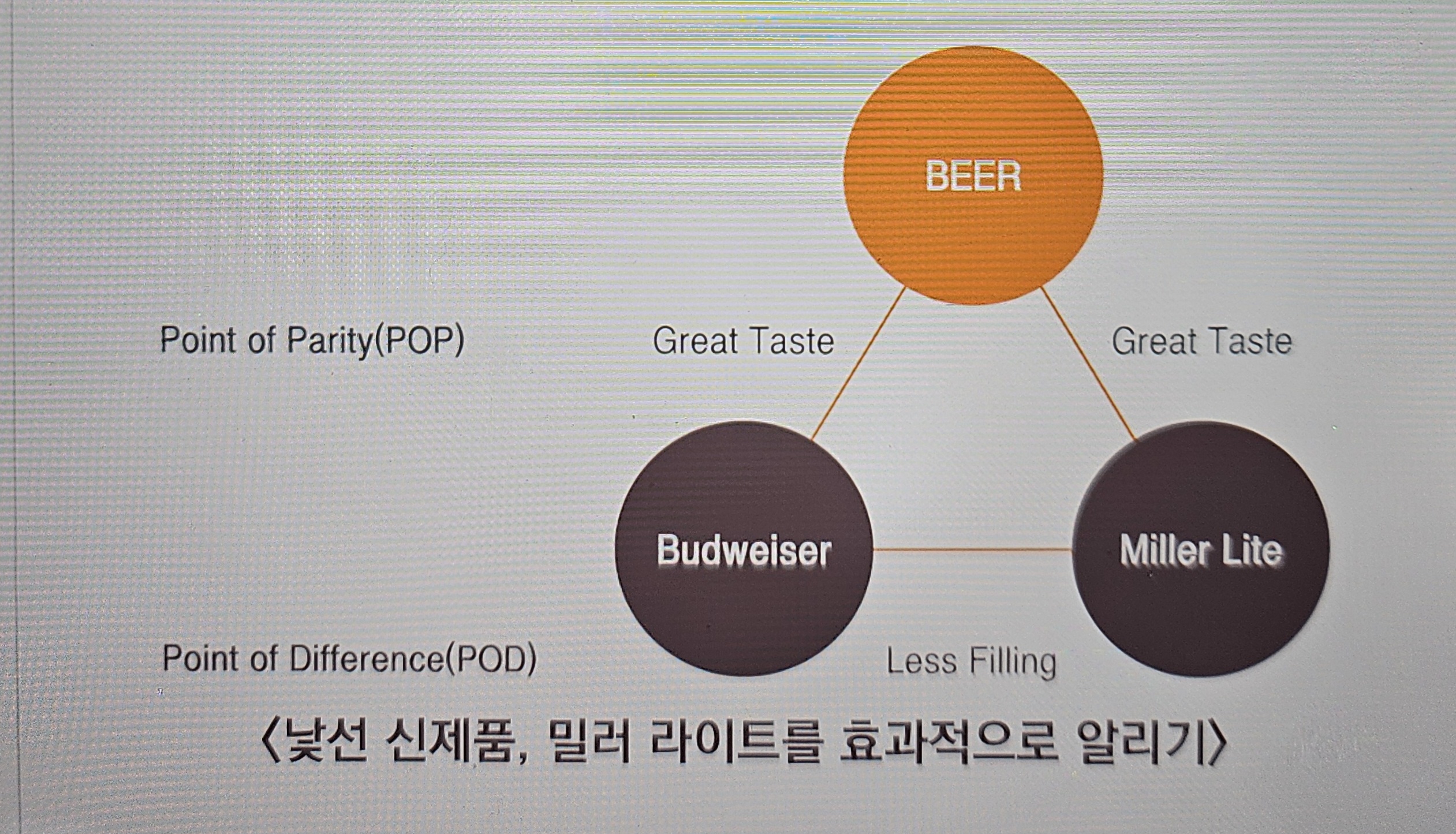 1970년대 미국의 맥주시장을 장악하고 있던 버드와이저에 대항하기위해 밀러는 바로 이 POP- POD 전략을 구가했다. 칼로리가 적은 맥주는 맛이 없을 거라는 사람들의 선입견을 깨기 위해, 버드와이저처럼 맛을 강조하면서도(Great Taste: POP), 탄수화물이 적어 배가 덜 부르다는 점(Less Filling: POD)을 내세움으로써 소비자들의 뇌리에 쉽게 파고들었다.
